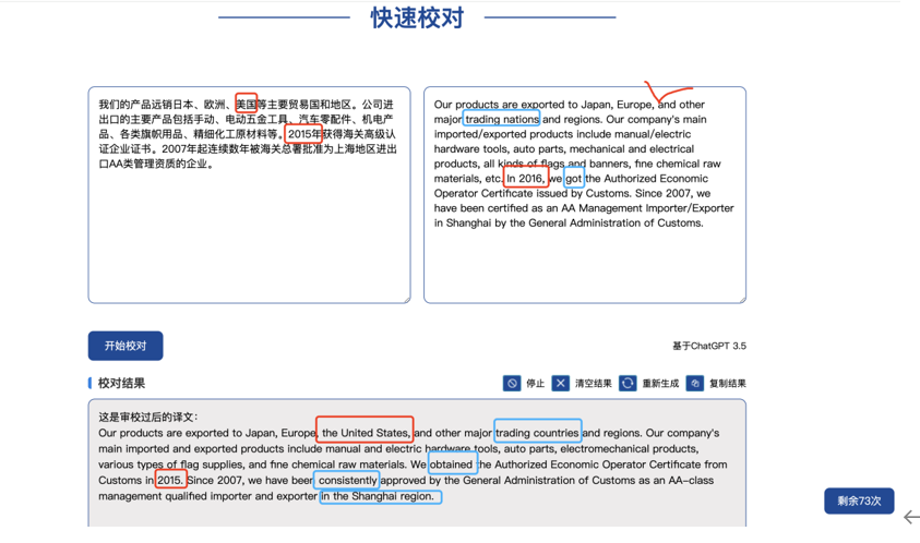 4. 【快速校对】:如您对翻译的准确性存疑,希望能快速校对译文中是否有简单的错误,那么这个功能正适合。只要您输入原文和译文,AI将自动检查译文中是否存在数字、语法、漏译等低级错误。提高您校对文档的效率。