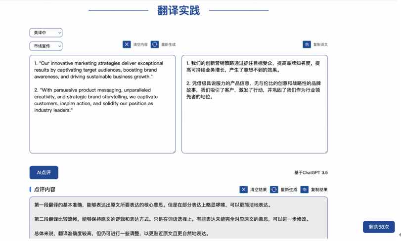 5. 【翻译实践】:如您是一名语言专业学生或者语言学习爱好者,那么可以选择语言和领域,系统将自动生成一段文字供您翻译。另外,您还可以点击AI点评来查看自己的翻译质量。当然我们必须承认AI点评不能替代人工点评,只能作为您翻译练习的参考。值得一提的是翻译实践功能是不消耗您Lingua-Pro的使用额度的,您可以放心使用。