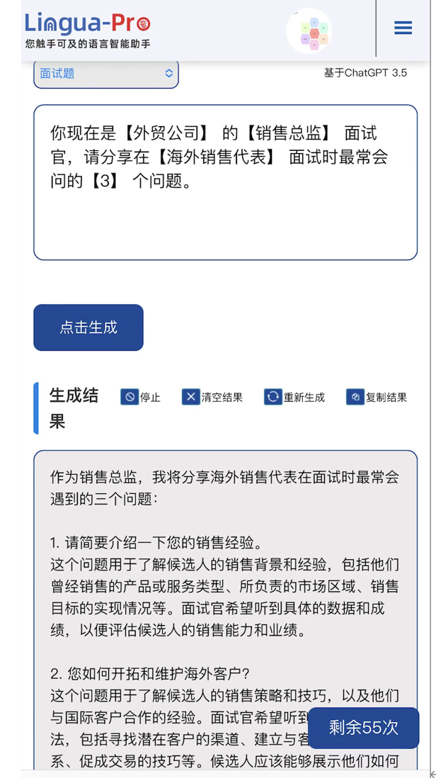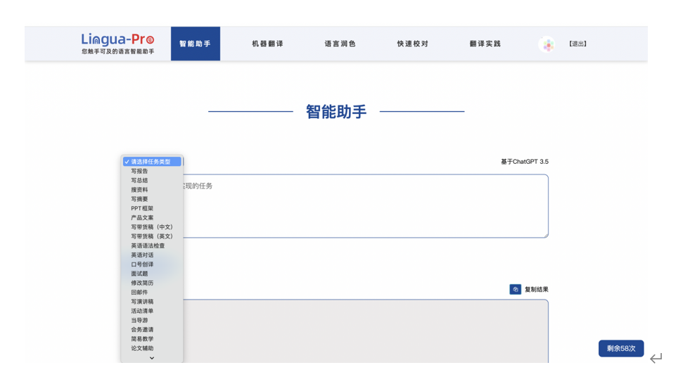 Lingua-Pro 是上海源语信息技术中心开发的一款基于 ChatGPT 为内核、多语言、多场景任务的人工智能语言助手,适合职场人士、文字工作者、语言专业学生、老师等。它好用、实用、易用,能够极大提高您的效率,并且使用成本也极低。