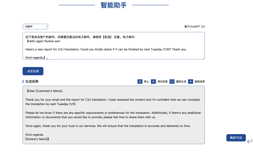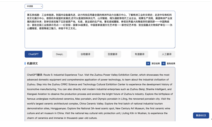 2. 【机器翻译】:接入ChatGPT翻译、DeepL、谷歌翻译、百度翻译、有道翻译。目前支持常用的语种翻译,如需更多语种的翻译,您可以在智能助手功能中实现。如您对翻译质量要求很高,您也可以点击人工翻译咨询我们提供的语言服务。