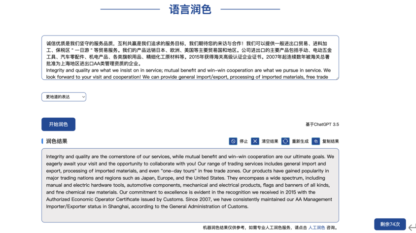 3. 【语言润色】:只要您输入原文和译文(或者单语言),并点击润色,即可快速实现基于AI的语言润色,给您改写文案提供一定的启发。值得一提的是,目前Lingua-Pro支持多种语言风格的润色,包括:更地道的语言风格, 更精练的语言风格, 更具体的语言风格, 更客观的语言风格, 更具学术的语言风格, 更正式的语言风格 等10种风格,让您一键实现文本的改写。